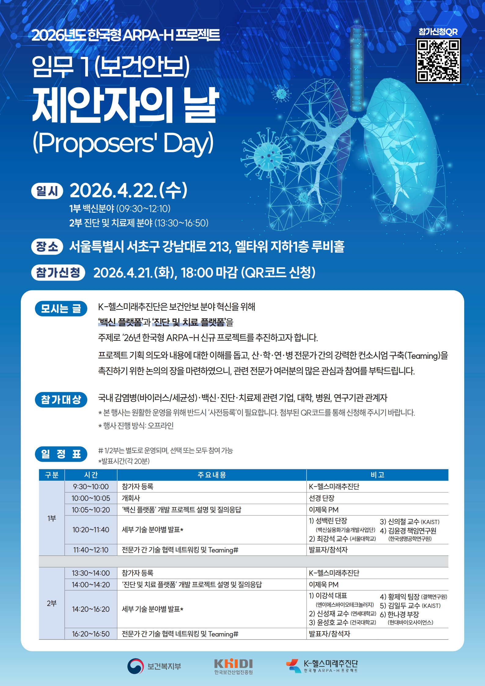 [한국보건산업진흥원] 2026년도 한국형 ARPA-H 프로젝트 임무1(보건안보) 제안자의 날(Proposers' Day) 개최 안내